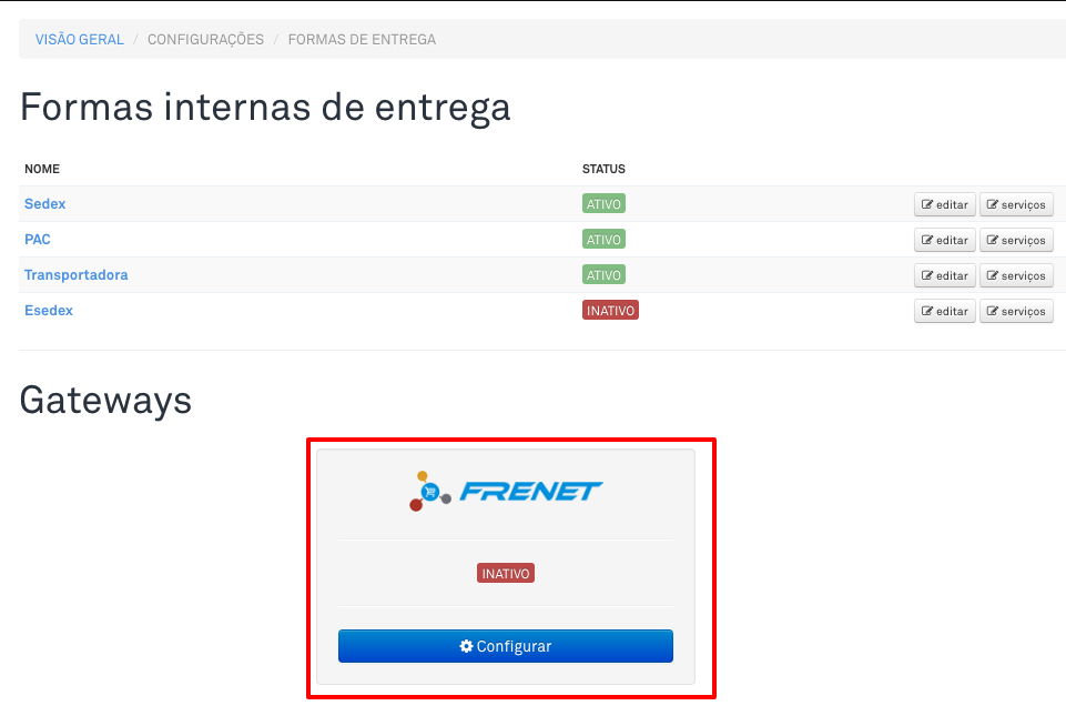 Configuração Módulo Frenet – Bubb Store Veja como é simples configurar o módulo Frenet em sua loja Bubb Store: Navegue até o menu Logística > Formas de entregae clique no logotipo da Frenet, conforme a imagem abaixo: Preencha os campos: “Cep de origem“ “Token” – Para obter o token Frenet acesse o Painel (https://painel.frenet.com.br) vá na aba “Cadastro” navegue até “Dados Cadastrais“. Você verá que a direita existe um campo chamado “Chave de acesso” onde está localizada seu Token, conforme a imagem. Depois de ter inserido o CEP de origem e o Token, estará pronta a integração entre Frenet e Bubb Store. Atualizado em 11 de novembro de 2025 Palavras chaves:Bubb Storeintegração de pedidosintegraçõesPlataformas Este artigo foi útil? Yes No Artigos Relacionados Saiba como integrar a plataforma Vale da Web com o sistema Frenet Saiba como integrar a Frenet com a plataforma Lojcomm TUTORIAL – Integração com ERP Solares Cloud TUTORIAL – Integração com a plataforma Moovin TUTORIAL – Integração com a plataforma eCShop Saiba como integrar a Frenet com a plataforma imprima STORE