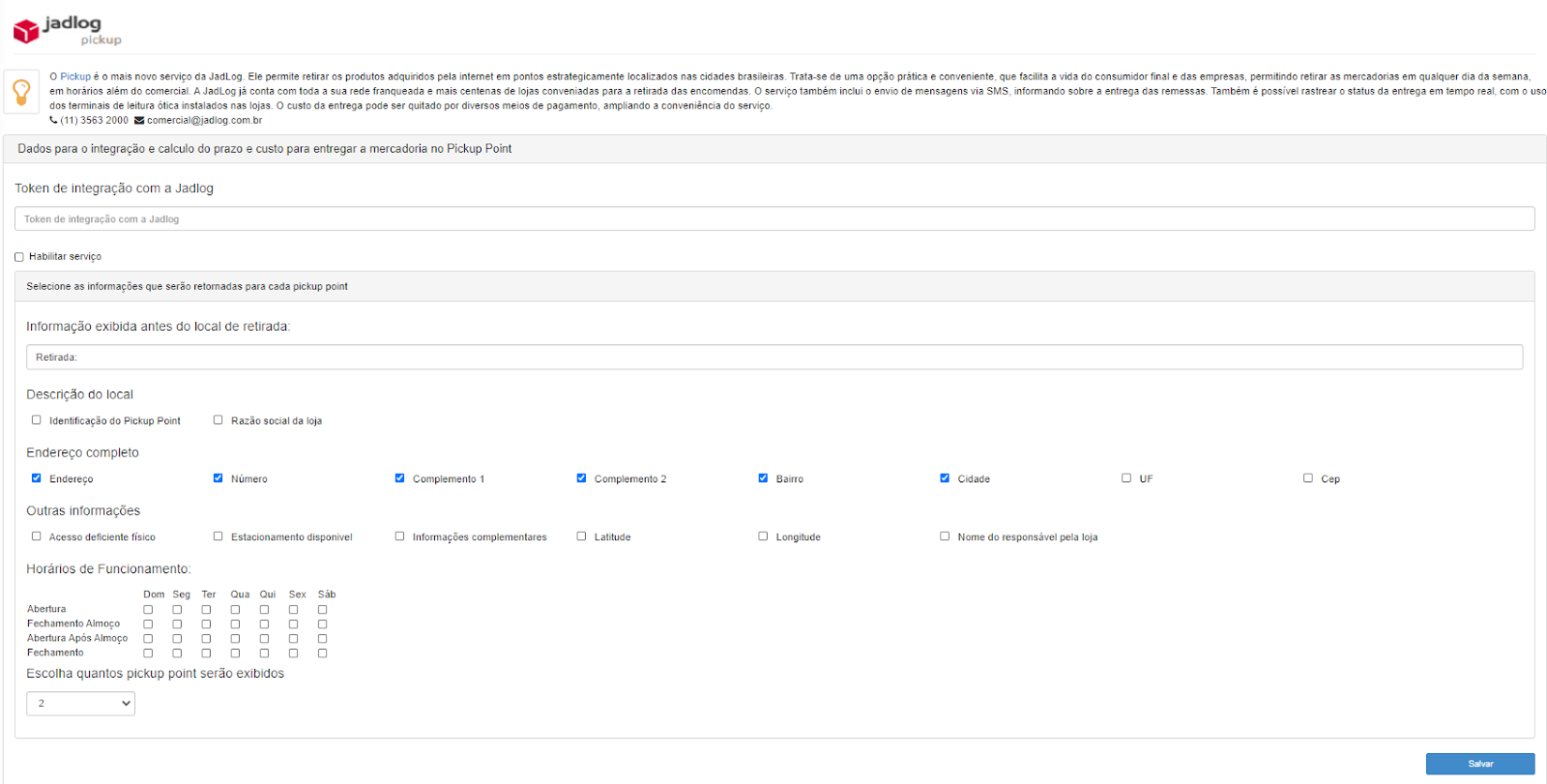 Saiba como ativar o serviço Pickup da transportadora Jadlog na Frenet Neste artigo, você vai conhecer o passo a passo para a ativação do serviço Pickup da transportadora Jadlog. A configuração é via webservice e com alguns cliques a sua loja virtual já terá acesso a esse serviço da Jadlog. O serviço Jadlog Pickup oferece a opção do cliente final retirar a sua mercadoria na agência da transportadora Jadlog mais próxima da sua residência/cidade com maior flexibilidade de dia e horário. Além disso, permite também a logística reversa, facilitando a devolução e troca de encomendas.Atenção: para a ativação do serviço Pickup da transportadora Jadlog no sistema Frenet, é necessário que você tenha em mãos um token de acesso específico para o serviço webservice. Este token é fornecido pela Jadlog. Caso você ainda não tenha essa informação, entre em contato com a Jadlog.IMPORTANTE: para ativar qualquer transportadora na Frenet utilizando o seu contrato, é necessário que você tenha assinado um plano Frenet com mensalidade.Com as informações necessárias em mãos, siga o passo a passo abaixo: No site da Frenet, clique em “ACESSAR MEU PAINEL” e faça seu login. Após o login, clique nas opções “MEIOS DE ENVIO” e “TRANSPORTADORAS”, localizada na barra lateral, à esquerda da página; Na seção “Meios de envio disponíveis para cotação na sua loja via seu contrato”, escreva “Jadlog Pickup” no campo de busca e pressione a tecla “ENTER” para efetuar a pesquisa. Em seguida, clique no logo da Jadlog Pickup; Você será direcionado para a tela de configurações do serviço; Nos campos da página, habilite e preencha as informações de configuração do serviço: TOKEN DE INTEGRAÇÃO COM A JADLOG: TOKEN (obrigatório): insira o token fornecido pela transportadora Jadlog; HABILITAR SERVIÇO: marque esse campo para habilitar o serviço em sua conta; INFORMAÇÃO EXIBIDA ANTES DO LOCAL DE RETIRADA: Este campo está disponível para personalizar o nome do serviço que será exibido em sua loja. Dica: É importante destacar que se trata de um ponto de retirada na agência da transportadora Jadlog, pois esta opção de frete será apresentada juntamente com as outras opções de entregas. DESCRIÇÃO DO LOCAL: IDENTIFICAÇÃO DO PICKUP POINT: habilitando essa opção, será apresentado o nome do serviço em sua loja; RAZÃO SOCIAL DA LOJA: habilitando essa opção, será apresentado a razão social da loja de retirada na transportadora Jadlog; ENDEREÇO COMPLETO: Deverá habilitar todas as opções que deseja que apareçam de informação da loja Jadlog para o seu cliente; OUTRAS INFORMAÇÕES: Nesta aba estão disponíveis informações adicionais. Caso deseje que alguma dessas informações sejam apresentadas em sua loja, você deverá marcar as opções que desejar; HORÁRIO DE FUNCIONAMENTO: Você deverá selecionar os horários de funcionamento da loja Jadlog escolhida por você. Essas informações serão apresentadas em seu site; ESCOLHA QUANTOS PICKUP POINT SERÃO EXIBIDOS: Nesta aba defina o número de pontos de retirada que serão exibidos como opção aos seus clientes; Atenção: Não tem um número mínimo e um número máximo de pontos de retirada. Você pode colocar a quantidade de pontos que for necessária. Para finalizar as configurações e ativar o(s) serviço(s) pickup, clique no botão “SALVAR”. Para conferir os seus serviços de entrega, clique na aba “CONFIGURAÇÃO PICKUP POINT. Nesta aba, você pode conferir os códigos de serviços que serão associados a cada ponto de retirada. Com esses códigos, é possível verificar o serviço contratado em cada um dos seus pedidos; Para saber quais são os pontos de retirada do serviço Pickup Jadlog, consulte o site da Jadlog, através do link . Para outras dúvidas, entre em contato com o nosso suporte pelo e-mail: suporte@frenet.com.br Atualizado em 11 de novembro de 2025 Palavras chaves:Jadlogregras de postagemtransportadoras Este artigo foi útil? Yes No Artigos Relacionados Consigo enviar produtos na Jadlog somente com Declaração de Conteúdo? O que é redespacho de mercadorias? Porque o valor do recibo do Correios é diferente do cobrado na Frenet? Conheça as regras de postagem da iMile com o contrato Frenet Quantas transportadoras posso ter na minha conta? Qual o prazo de ressarcimento dos Correios?