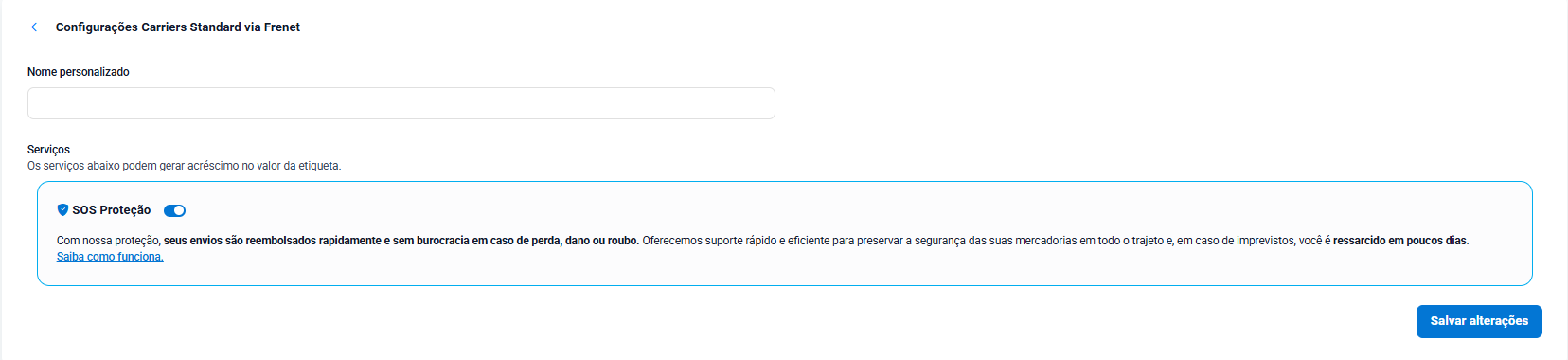 Como deixar o SOS Proteção ativo para todos os envios emitidos na Frenet? O SOS Proteção é um serviço adicional para reembolsar rapidamente e sem burocracia mercadorias enviadas com etiquetas de frente com os contratos Frenet em caso de perda, dano ou roubo. Sendo assim, é possível deixar essa o SOS Proteção ativo para todos os envios com o contrato Frenet. Para isso, siga o passo a passo abaixo: Clique em “MEIOS DE ENVIO” e “TRANSPORTADORAS” localizados no menu esquerdo do painel administrativo Frenet; Feito isso, escolha uma das transportadoras disponíveis com o contrato Frenet e clique sobre ela; Depois, clique na engrenagem; Em seguida, habilite a flag do SOS Proteção e clique em “SALVAR ALTERAÇÕES”; Feito isso, repita o mesmo passo a passo para todas as transportadoras com o contrato Frenet que você deseja ativar o SOS Proteção. Para solicitar o reembolso em caso de perda, dano ou roubo, abra um chamado para o nosso suporte diretamente na tela de etiquetas. Clique aqui e confira o passo passo. Atualizado em 11 de novembro de 2025 Palavras chaves:indenizaçõesressarcimentosSOS Proteção Este artigo foi útil? Yes No Artigos Relacionados Qual o custo do SOS Proteção? Quais produtos são proibidos no SOS Proteção? Saiba com funciona o ressarcimento da transportadora Jadlog Saiba como funciona o ressarcimento da transportadora Loggi Como funciona o ressarcimento dos Correios em casos de avaria? Quais produtos são considerados frágeis pelo SOS Proteção?