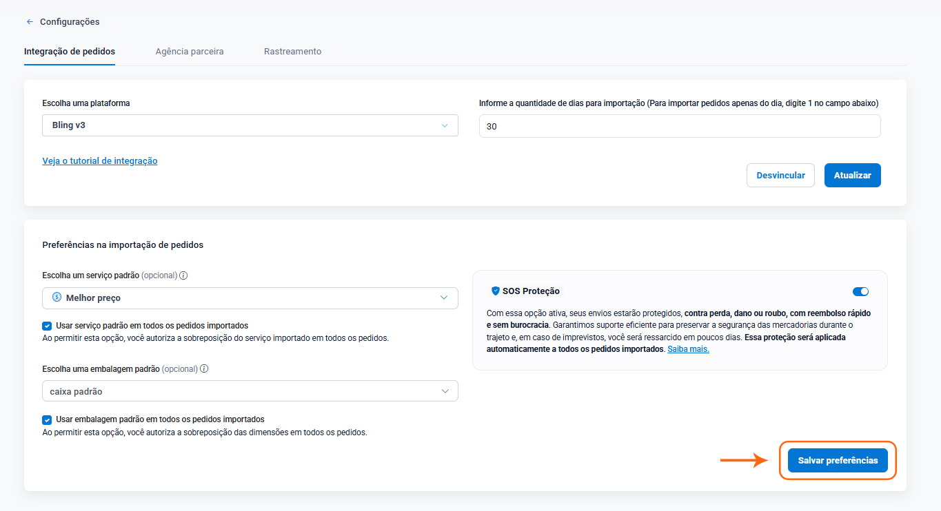 • Habilite o campo caso deseje utilizar o SOS Proteção que todos os seus envios importados;