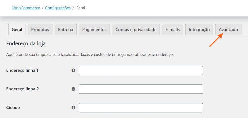 1. No seu painel do WooCommerce, clique em “WOOCOMMERCE”, localizado na barra lateral esquerda da página. Em seguida, clique em “CONFIGURAÇÕES”;