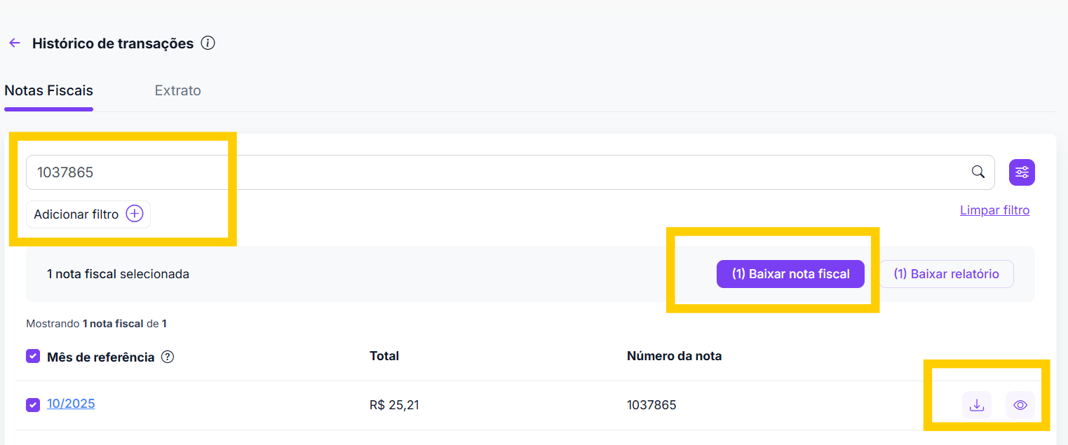 1. Na aba Notas Fiscais, você poderá visualizar ou baixar as notas fiscais disponibilizadas, além de pesquisar pela etiqueta ou pelo número da Nota Fiscal, podendo ainda incluir um filtro de período: