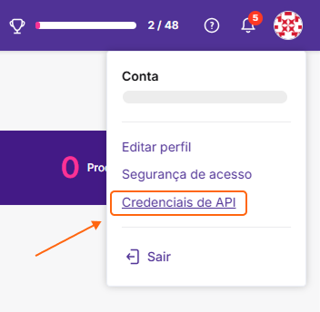 Acesse sua conta Yampi, clique na imagem no canto superior direito e depois clique em “Credenciais de API”;