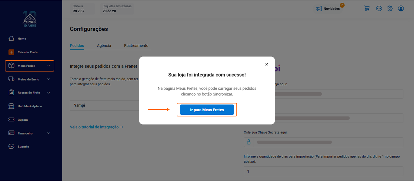 Após realizar a integração de pedidos, clique em “Ir para Meus Fretes” no pop-up que aparece;