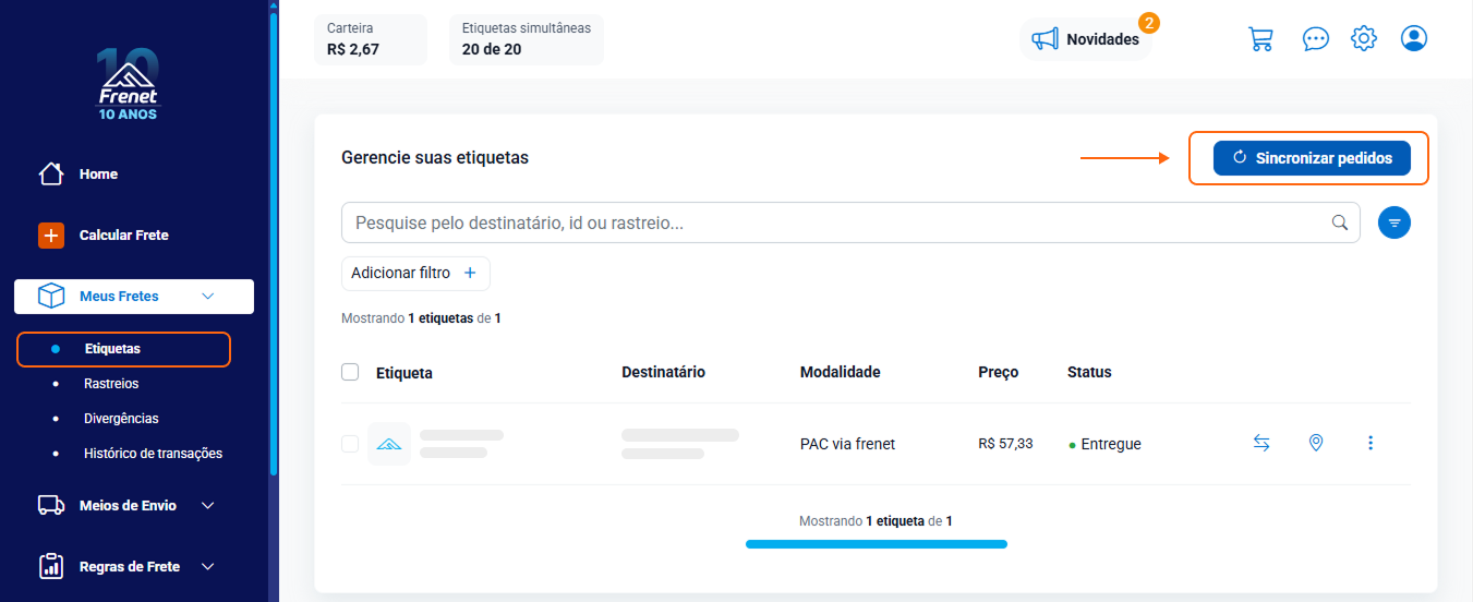 Obs.: Essa seção também está no menu lateral esquerdo, em Meus Fretes > Etiquetas.
