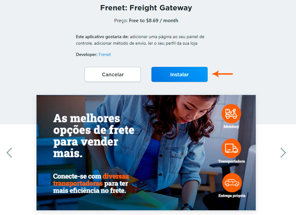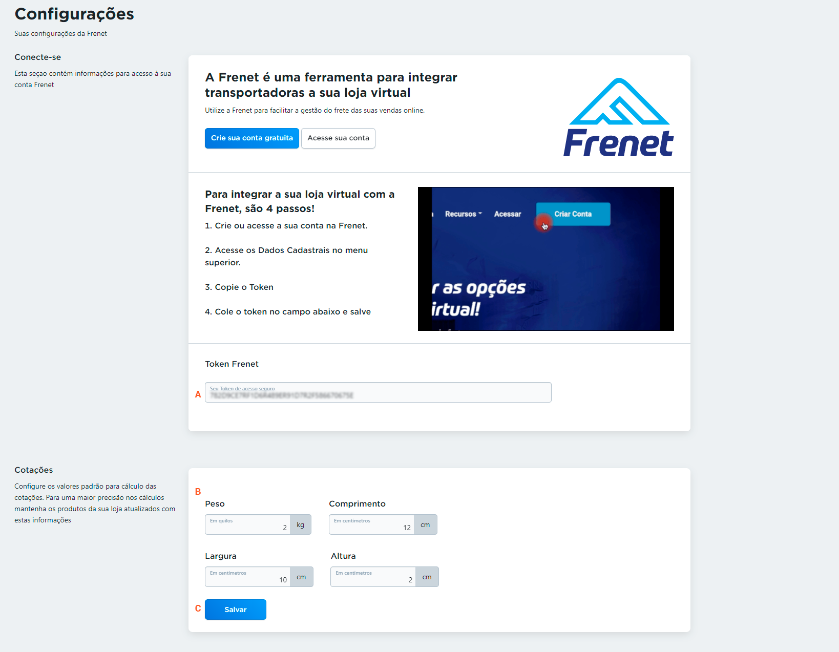 Saiba como integrar a Frenet na plataforma Duda Para realizar essa configuração, é necessário que você tenha em mãos o Token Frenet. Caso você ainda não tenha essa informação, veja abaixo como consegui-la. Caso já tenha, vá direto para o 2º passo deste tutorial. 1º Passo: Encontrar o Token Frenet No site da Frenet, clique em “ACESSAR MEU PAINEL” e faça seu login. No canto superior direito, clique no ícone de usuário e selecione a opção “DADOS CADASTRAIS”; Na seção chaves de acesso, copie o “TOKEN” disponível no campo da página e guarde-o para inserir na plataforma da Duda; 2º Passo: Integração na plataforma Duda Acesse sua conta na plataforma Duda; Após efetuar seu login, clique na opção “CONFIGURAÇÃO DA LOJA”, localizada na barra lateral esquerda. Em seguida, clique em “APLICATIVOS” e depois em “MERCADO DE APLICATIVOS”; Role a página até encontrar o logotipo da Frenet e clique para adicionar o app; Clique no botão azul “INSTALAR”; Em seguida, clique novamente no botão azul “INSTALAR” para confirmar a instalação; Na página, preencha os campos a seguir: Copie ou escreva seu token Frenet no campo indicado; Esse campo é automaticamente preenchido com as dimensões padrões de envio. Caso necessário, altere as dimensões da embalagem; Atenção: As cotações serão feitas com base na dimensão padrão indicada neste campo para os planos abaixo do “Advanced”, já no plano “Advanced” ou superior, as cotações serão feitas através da dimensão cadastrada no produto. Clique no botão azul “SALVAR”; Pronto! Após realizar esses passos, a plataforma Duda estará integrada na sua conta Frenet. Para outras dúvidas, entre em contato com o nosso suporte pelo email: suporte@frenet.com.br Atualizado em 11 de novembro de 2025 Palavras chaves:Dudaintegração de pedidosintegraçõesPlataformas Este artigo foi útil? Yes No Artigos Relacionados Saiba como integrar a plataforma Vale da Web com o sistema Frenet Saiba como integrar a Frenet com a plataforma Lojcomm TUTORIAL – Integração com ERP Solares Cloud TUTORIAL – Integração com a plataforma Moovin TUTORIAL – Integração com a plataforma eCShop Saiba como integrar a Frenet com a plataforma imprima STORE