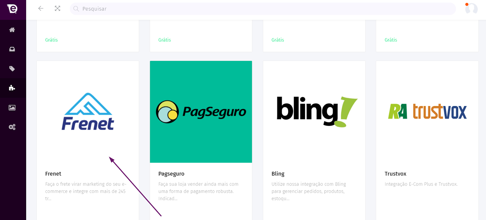 2. No menu esquerdo do painel administrativo, clique no ícone  “APLICATIVOS”,, em seguida, role a página para baixo até encontrar o ícone da Frenet