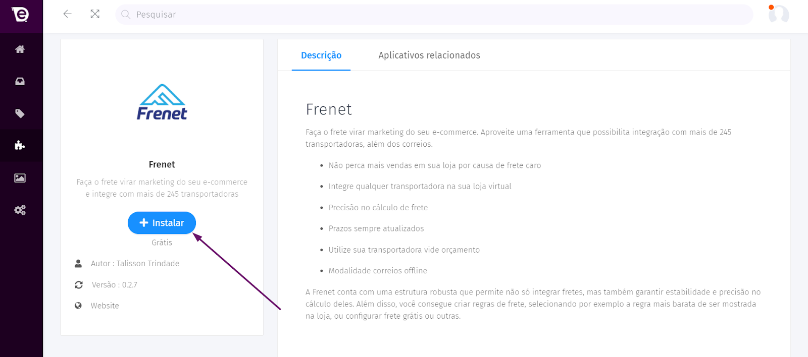 1. Após clicar no ícone da Frenet, clique no botão azul “INSTALAR”;