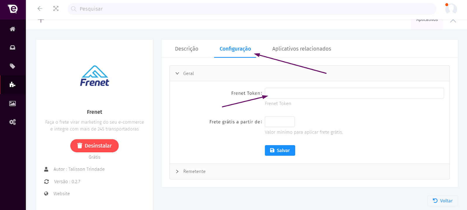 1. Copie ou escreva seu Token Frenet no campo “Frenet Token”;