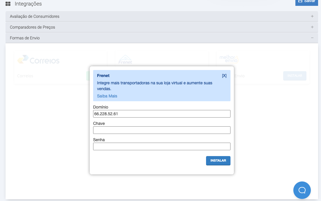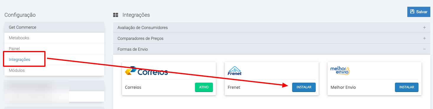 Saiba como integrar a Frenet com a plataforma Get.Commerce Neste artigo de configuração, você vai conhecer o passo a passo para integrar a plataforma Get.Commerce no sistema Frenet. Para realizar essa configuração, é necessário que você tenha em mãos sua chave de acesso e senha Frenet. Caso você ainda não tenha essa informação, veja abaixo como consegui-la. Caso já tenha, vá direto para o 2º passo deste tutorial. 1º Passo: Encontrar a chave de acesso e senha Frenet No site da Frenet, clique em “ACESSAR MEU PAINEL” e faça seu login; No canto superior direito, clique no ícone de usuário e selecione a opção “DADOS CADASTRAIS”; Na seção chaves de acesso, copie a “CHAVE” e a “SENHA” disponíveis nos campos da página e guarde-os para inserir na plataforma da Get.Commerce; 2º Passo: Integração com a plataforma Get.Commerce Acesse seu painel administrativo na Get.Commerce; Após o login, clique no menu “SISTEMA” e em seguida na opção “CONFIGURAÇÃO”; Na barra esquerda do painel administrativo, clique na opção “INTEGRAÇÕES” e acesse a aba “FORMAS DE ENVIO”; Em seguida, clique no botão azul “INSTALAR” do módulo Frenet; Nos campos da página, informe sua chave e senha Frenet. Em seguida clique no botão azul “INSTALAR”; Para finalizar a configuração, clique no botão azul “SALVAR”. Atualizado em 11 de novembro de 2025 Palavras chaves:Get.Commerceintegração de pedidosintegraçõesPlataformas Este artigo foi útil? Yes No Artigos Relacionados Saiba como integrar a plataforma Vale da Web com o sistema Frenet Saiba como integrar a Frenet com a plataforma Lojcomm TUTORIAL – Integração com ERP Solares Cloud TUTORIAL – Integração com a plataforma Moovin TUTORIAL – Integração com a plataforma eCShop Saiba como integrar a Frenet com a plataforma imprima STORE