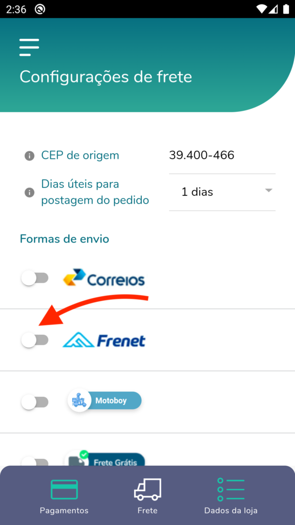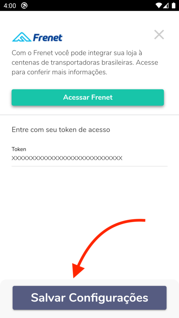 Saiba como integrar a plataforma da H2R com a Frenet em sua loja virtual O sistema Frenet permite a integração com plataformas de e-commerce de diversos parceiros, facilitando o gerenciamento das suas vendas e garantindo as melhores opções de frete. Com a Frenet, os clientes da H2R tem diversas vantagens, como até 80% de desconto no envio de frete via Correios e benefícios com transportadoras da sua preferência. Veja abaixo o passo a passo para integrar a sua loja no e-commerce da H2R por meio da Frenet. 1º Passo: Configuração no portal Frenet. No site da Frenet, clique em “ACESSAR MEU PAINEL” e faça seu login. No canto superior direito, clique no ícone de usuário e selecione a opção “DADOS CADASTRAIS”; Na seção chaves de acesso, copie o “TOKEN” disponível neste campo da página e guarde para inserir na plataforma da H2R; Atenção: Para ativar o TOKEN na Frenet, é necessário que todos os dados cadastrais sejam preenchidos e que você realize uma verificação que será enviada no seu email cadastrado. 2º Passo: Configuração na plataforma H2R. Acesse seu painel administrativo na H2R, efetuando login por meio do aplicativo Android. Após o login, clique no menu do aplicativo localizado no canto superior esquerdo. Selecione a opção “CONFIGURAÇÕES”; Em seguida clique na opção “FRETE”; Na tela será exibida as configurações de frete. Role a tela para baixo até encontrar a “FRENET” e ative essa opção selecionando o marcador. Insira o seu token “FRENET” no campo indicado. Clique no botão “SALVAR AS CONFIGURAÇÕES” para integrar a sua loja virtual com as transportadoras disponíveis na Frenet. Após realizar esse passo a passo, o seu cliente pode calcular fretes pela FRENET digitando o CEP da região. Para outras dúvidas, entre em contato com o nosso suporte pelo email: suporte@frenet.com.br Atualizado em 11 de novembro de 2025 Palavras chaves:H2Rintegração de pedidosintegraçõesPlataformas Este artigo foi útil? Yes No Artigos Relacionados Saiba como integrar a plataforma Vale da Web com o sistema Frenet Saiba como integrar a Frenet com a plataforma Lojcomm TUTORIAL – Integração com ERP Solares Cloud TUTORIAL – Integração com a plataforma Moovin TUTORIAL – Integração com a plataforma eCShop Saiba como integrar a Frenet com a plataforma imprima STORE