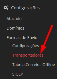2. Após efetuar seu login, clique na opção “CONFIGURAÇÕES”, localizada na barra do menu lateral. Em seguida, clique em “FORMAS DE ENVIO” e depois “TRANSPORTADORAS”;