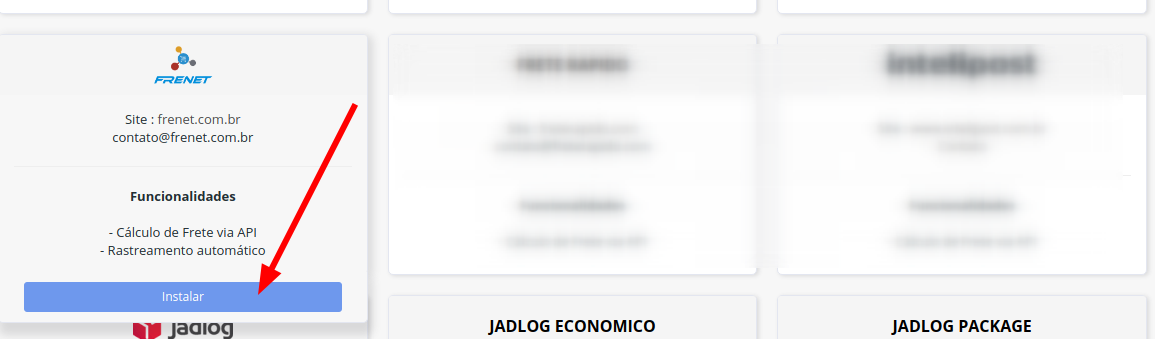 1. Na página, procure pelo ícone da Frenet e clique no botão azul “INSTALAR”;