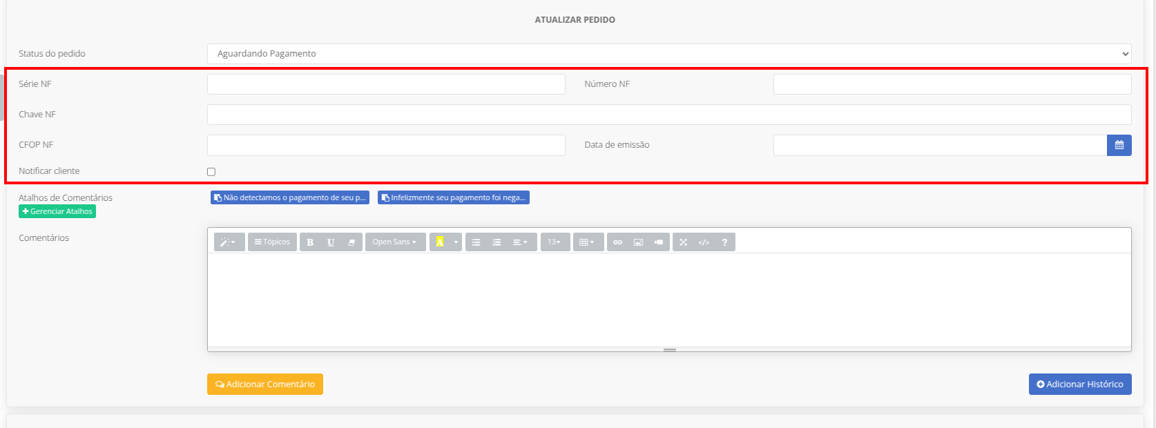 1. Abra o pedido que deseja importar, role a página e preencha os campos com as informações da nota fiscal;