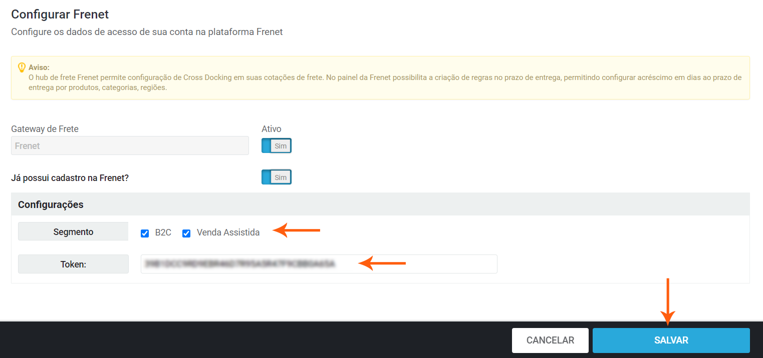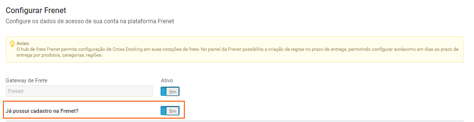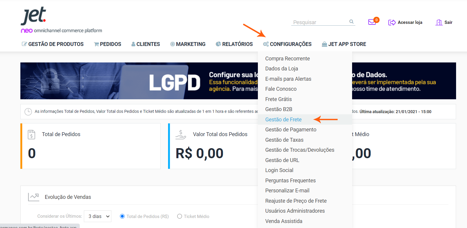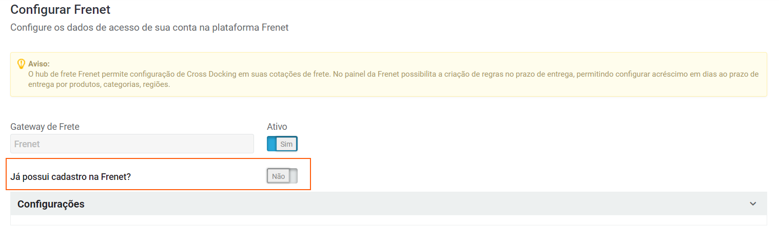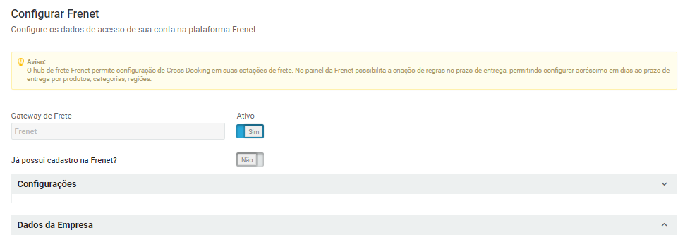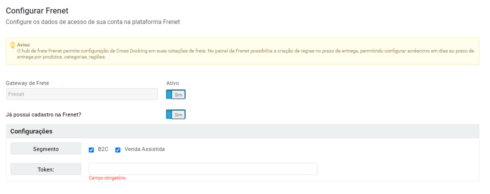 Saiba como integrar a plataforma Jet com o sistema Frenet Nesse artigo você vai conhecer o passo a passo para integrar a plataforma JET em sua conta Frenet. 1º Passo: Acesse a plataforma JET. Após efetuar seu login, acesse o menu “CONFIGURAÇÕES”. Em seguida, clique em “GESTÃO DE FRETE”; Na tela de gestão de frete, o primeiro passo é configurar o CEP de origem. CEP DE ORIGEM (obrigatório): insira o CEP do local que irá partir a sua mercadoria para as cotações de frete; Para salvar as informações do CEP de origem, clique no botão azul “APLICAR”. Na sequência, clique no botão azul “CONFIGURAR” abaixo do logotipo Frenet. Será apresentada a página para configurar o módulo Frenet. Para habilitar os serviços Frenet, deixe a opção ativo marcada como “SIM”. Assim que habilitar o módulo Frenet, a página de configurações será aberta, como mostra a imagem a seguir: Para realizar a integração, deixe ativo a opção “Já possui cadastro Frenet?” marcada como “SIM”. Caso você não tenha uma conta, vá para o 2º passo deste tutorial. Ao habilitar a sua conta Frenet, uma nova aba de configurações será aberta para que você possa realizar a integração dos serviços. Para encontrar o token, abra uma nova aba ou janela em seu computador, acesse o site da Frenet, clique em “ACESSAR MEU PAINEL” e faça seu login; No canto superior direito, clique no ícone de usuário e selecione a opção “DADOS CADASTRAIS”; Na seção chaves de acesso, copie o “TOKEN” disponível no campo da página e guarde para inserir na plataforma JET; Volte para a tela de configuração da JET. Nos campos da página, preencha as informações: SEGMENTO: por padrão já estarão habilitadas as modalidades de segmento B2C e Venda Assistida; Observação: o segmento B2C é exclusivo e garante aos usuários que utilizem a plataforma JET a opção pelos serviços da Frenet. Já o segmento Venda Assistida é o módulo de venda online e ponto físico, no qual o vendedor da loja física consegue acessar e realizar vendas pelo e-commerce, disponibilizando ao cliente a opção de retirar a mercadoria na loja ou receber em sua casa por meio dos serviços de frete. TOKEN (obrigatório): insira o token de sua conta Frenet. Para finalizar a integração, basta clicar no botão azul “SALVAR”. Pronto! Após realizar esses passos, a plataforma JET estará integrada na sua conta Frenet. Para os clientes que não possuem uma conta Frenet, basta seguir os passos abaixo: 2° Passo: Criando sua conta Frenet na plataforma da JET. Na plataforma JET é possível criar uma conta Frenet. Para isso, é necessário que a opção “Já possui cadastro na Frenet?” esteja desabilitada. Dessa forma, serão apresentadas as configurações para criar uma conta Frenet: Nos campos da página, preencha as seguintes informações: DADOS DA EMPRESA; RESPONSÁVEL; E-MAIL RAZÃO SOCIAL; CNPJ; INSCRIÇÃO ESTADUAL; CPF DO RESPONSÁVEL; TELEFONE; CEP; ENDEREÇO; NÚMERO; COMPLEMENTO (caso haja necessidade); BAIRRO; CIDADE; ESTADO. Depois de inserir todas as informações, clique no botão azul “SALVAR”. Pronto! Você já terá uma conta Frenet. Agora será necessário voltar novamente no item 7 do 1° passo deste tutorial para concluir a integração de sua conta Frenet com a plataforma JET. Para outras dúvidas, entre em contato com o nosso suporte pelo e-mail: suporte@frenet.com.br Atualizado em 11 de novembro de 2025 Palavras chaves:integração de pedidosintegraçõesJetPlataformas Este artigo foi útil? Yes No Artigos Relacionados Saiba como integrar a plataforma Vale da Web com o sistema Frenet Saiba como integrar a Frenet com a plataforma Lojcomm TUTORIAL – Integração com ERP Solares Cloud TUTORIAL – Integração com a plataforma Moovin TUTORIAL – Integração com a plataforma eCShop Saiba como integrar a Frenet com a plataforma imprima STORE