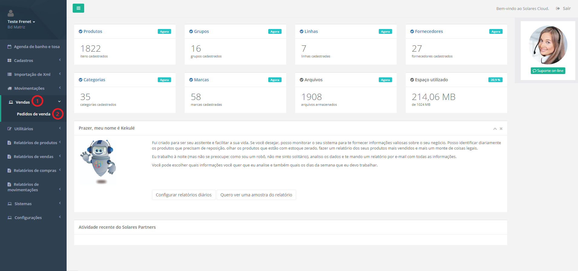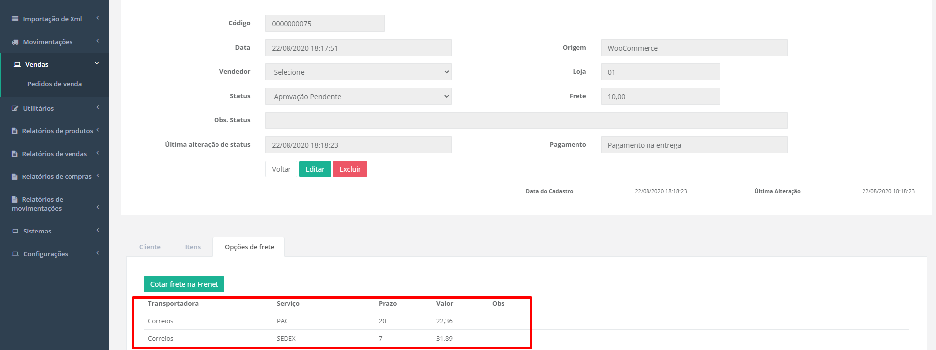 TUTORIAL – Integração com ERP Solares Cloud Siga os passos abaixo para realizar a integração da Frenet no ERP Solares Cloud Passo 1 Acesse o painel da Frenet. No canto superior direito, clique no ícone de usuário e selecione a opção “DADOS CADASTRAIS”; Na seção dados de acesso, copie o “TOKEN” disponível no campo da página e guarde-o para inserir na plataforma de ERP Solares Cloud; Passo 2 Configurando a integração No painel administrativo da Solares Cloud acesse a opção Configurações (1) – Integrações (2) – Frenet (3) Indique o CEP de origem (o mesmo cadastrado na Frenet) e o Token que copiou no passo 1 e clique em Gravar Pronto, sua configuração esta concluída. Calculando Frete Para calcular o frete em seus pedidos, acesse no menu a opção Vendas (1) – Pedidos de Venda(2) Pesquisar o período desejado e clique sobre a opção Visualizar em qualquer um dos pedidos que deseja realizar a cotação. Na aba Opções de Frete clique sobre o botão Cotar frete na Frenet Os valores dos fretes disponíveis serão apresentados na tela Pronto! =) Atualizado em 11 de novembro de 2025 Palavras chaves:ERPintegração de pedidosintegraçõesPlataformas Este artigo foi útil? Yes No Artigos Relacionados Saiba como integrar a plataforma Vale da Web com o sistema Frenet Saiba como integrar a Frenet com a plataforma Lojcomm TUTORIAL – Integração com a plataforma Moovin TUTORIAL – Integração com a plataforma eCShop Saiba como integrar a Frenet com a plataforma imprima STORE Saiba quais transportadoras possuem ativação via suporte Frenet